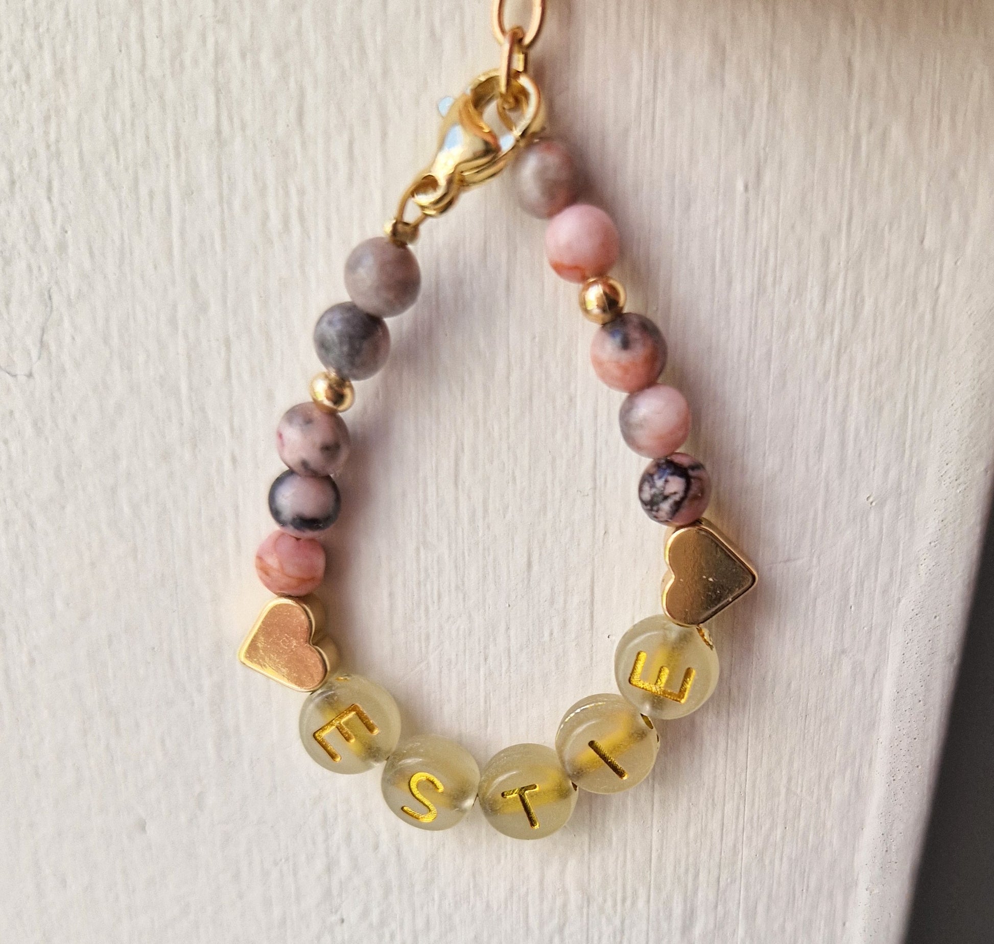 A cute personalised bracelet with glow in the dark golden letter beads.